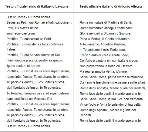 Roma luce delle genti, il mondo spera in te!Salve, Salve Roma, la tua luce non tramonta,