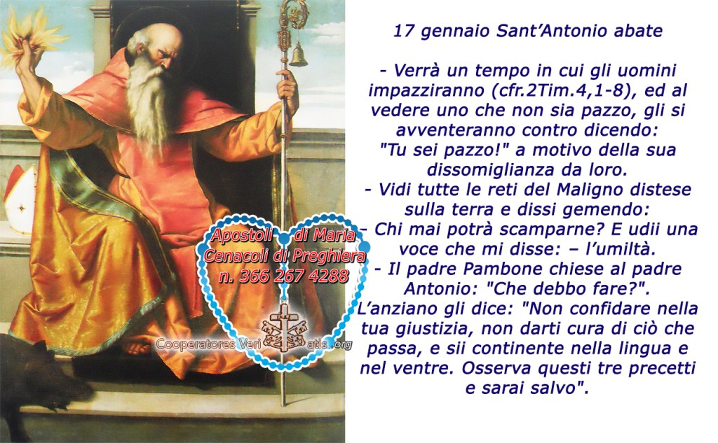 Antonio abate è uno dei più illustri eremiti della storia della Chiesa. Nato a Coma, nel cuore dell’Egitto, intorno al 250, a vent’anni abbandonò ogni cosa per vivere dapprima in una plaga deserta e poi sulle rive del Mar Rosso, dove condusse vita anacoretica per più di 80 anni: morì, infatti, ultracentenario nel 356.