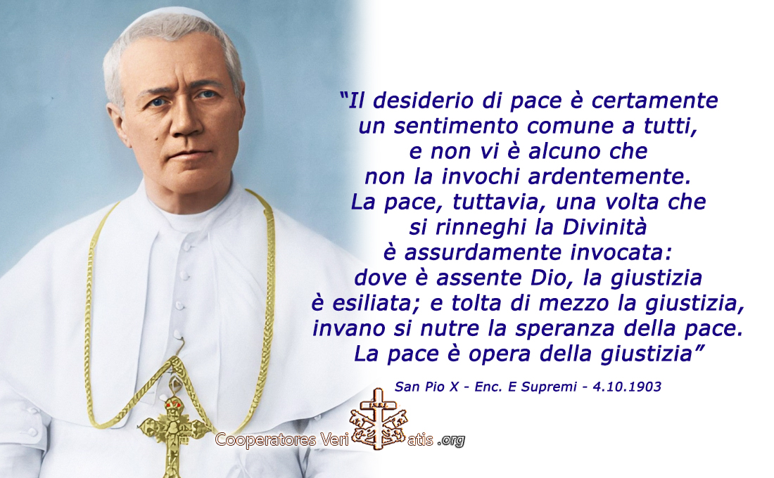 “Il desiderio di pace è certamente un sentimento comune a tutti, e non vi è alcuno che non la invochi ardentemente. La pace, tuttavia, una volta che si rinneghi la Divinità è assurdamente invocata: dove è assente Dio, la giustizia è esiliata; e tolta di mezzo la giustizia, invano si nutre la speranza della pace. “La pace è opera della giustizia” [16]. Noi sappiamo infatti che non sono pochi coloro che, sospinti dall’amore di pace e anche di “tranquillità” e di “ordine”, si raggruppano in associazioni e fazioni che definiscono “d’ordine”. Ahi, quali vane speranze e fatiche! Di partiti “dell’ordine”, che possano portare una pace reale nelle perturbazioni, ce n’è uno solo: il partito dei partigiani di Dio. Pertanto è necessario incoraggiarlo e condurre ad esso quante più persone si può, se ci sollecita l’amore per la sicurezza.”