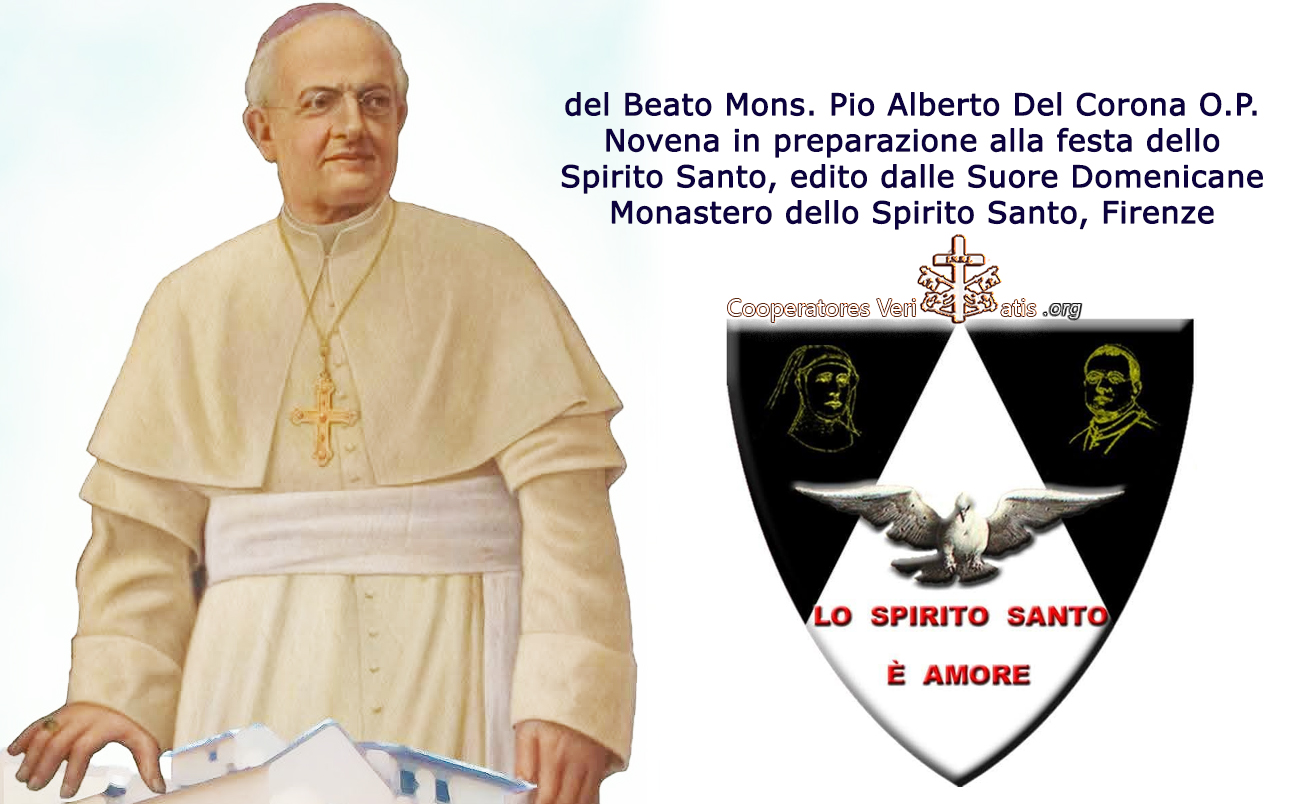 In questa pagina riproduciamo un testo composto dal Beato Mons. Pio Alberto Del Corona, la Novena di Pentecoste, una serie di meditazioni e preghiere allo Spirito Santo in preparazione della Solennità liturgica di Pentecoste. Il testo in alcuni tratti non è di facile comprensione, a causa dello stile (la retorica sacra di fine Ottocento) lontano dal linguaggio odierno, a causa dei concetti teologici impiegati per rischiarare il mistero dello Spirito Santo e della Trinità. Ci sono difficoltà che potrebbero scoraggiare i lettori meno volenterosi, ma il fedele di buona volontà, assaporando lentamente e con la dovuta attenzione il susseguirsi delle meditazioni, potrà ricavarne un frutto spirituale così abbondante da ripagarlo delle sue fatiche.