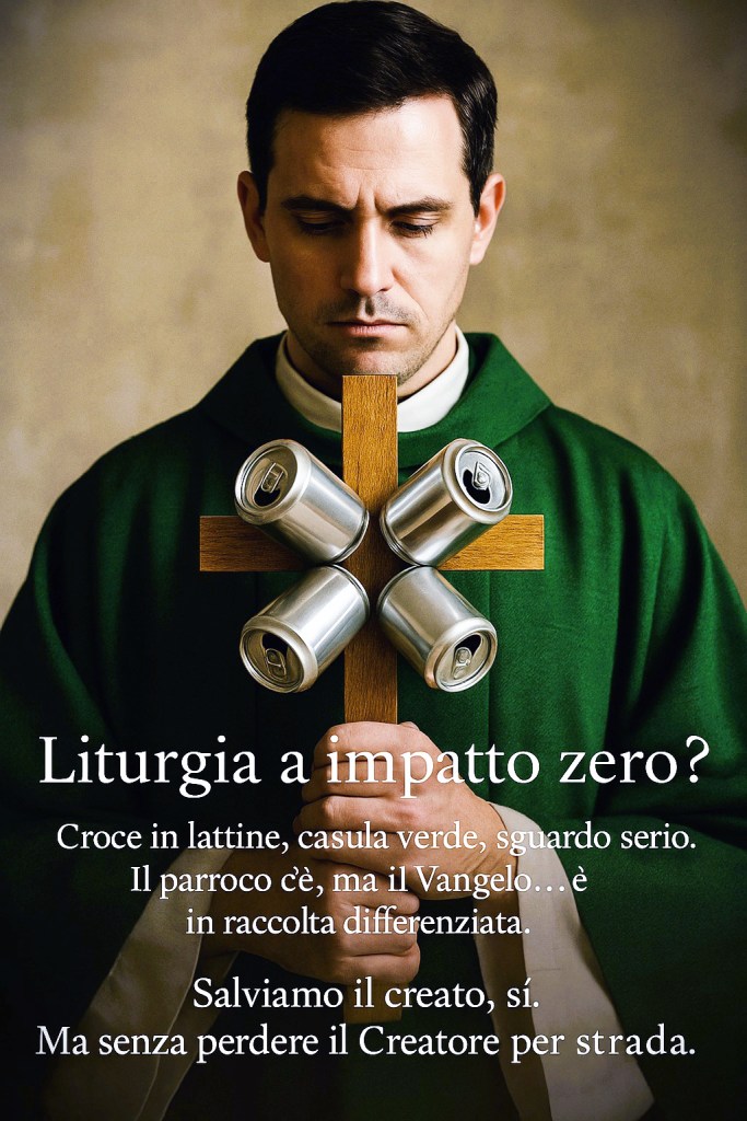 Oppure ci stiamo adattando al Vangelo secondo Greta, con il parroco vestito di verde e la croce fatta di lattine riciclate?