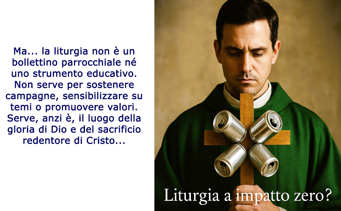 La liturgia non è un bollettino parrocchiale né uno strumento educativo. Non serve per sostenere campagne, sensibilizzare su temi o promuovere valori. Serve, anzi è, il luogo della gloria di Dio e del sacrificio redentore di Cristo. È il mistero pasquale che salva il mondo, non una maggiore coscienza ecologica.