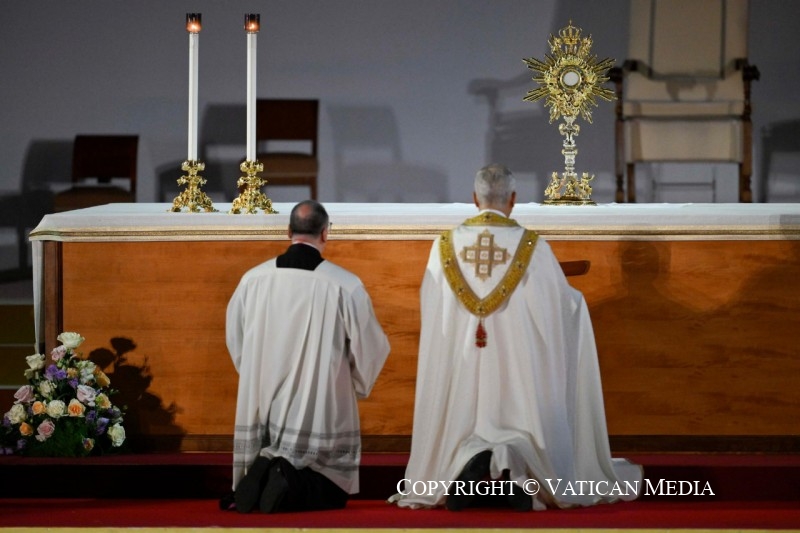 Sant’Agostino scriveva: «Tu ci spingi a provare piacere nel lodarti, perché ci hai fatti per te, e il nostro cuore è inquieto finché non riposa in te… Signore, io ti cerco… e invocarti è un atto di fede in te» ( Confessioni , I, 1). Seguendo queste parole di Agostino, e in risposta alle vostre domande, vorrei invitare ciascuno di voi a dire al Signore: «Grazie, Gesù, per avermi chiamato. Il mio desiderio è di rimanere come uno dei tuoi amici, così che, abbracciandoti, possa essere anche compagno di cammino per chiunque incontri. Fa’, o Signore, che chi mi incontra possa incontrare te, anche attraverso i miei limiti e le mie fragilità». Pregando queste parole, il nostro dialogo continuerà ogni volta che guarderemo il Signore crocifisso, perché i nostri cuori saranno uniti in Lui. Ogni volta che adoreremo Cristo nell’Eucaristia, i nostri cuori saranno uniti in Lui. Infine, la mia preghiera per voi è che possiate perseverare nella fede, con gioia e coraggio! E possiamo dire “Grazie Gesù che ci ami”. Grazie Gesù per averci amati. Grazie Gesù per averci chiamati. Resta con noi Signore. Resta con noi. Quédate con nosostros Signore.