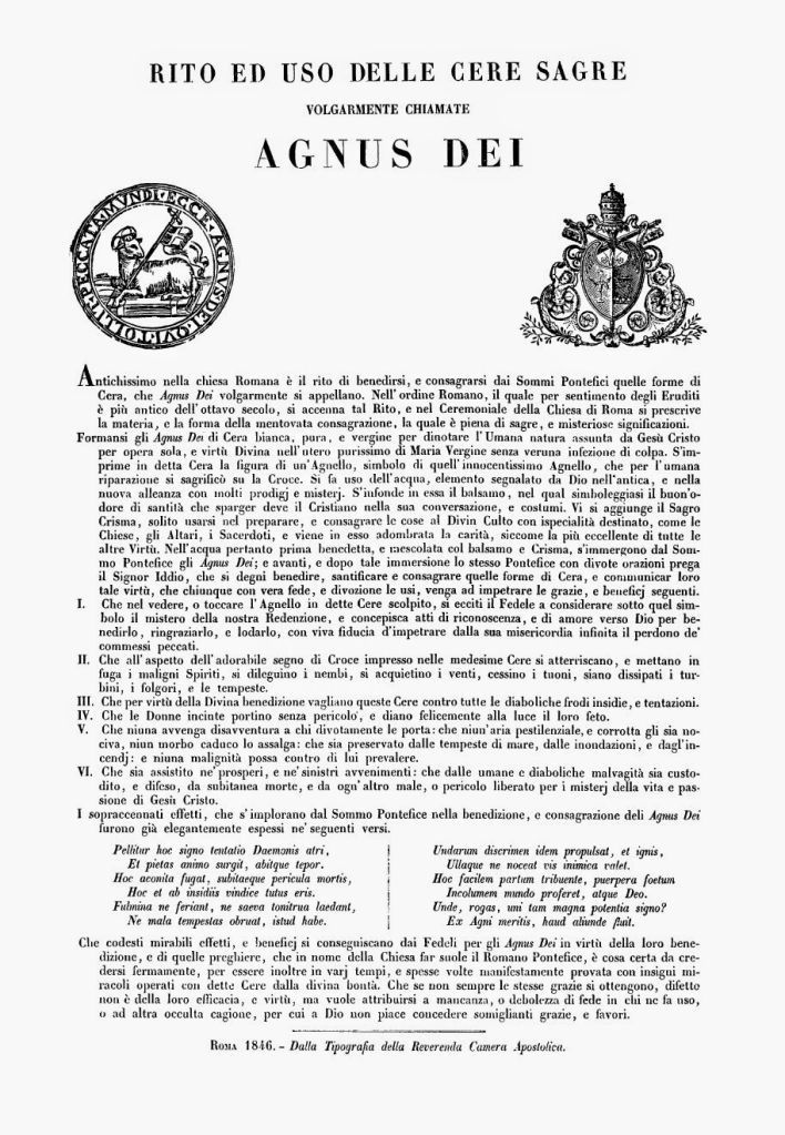 Gli effetti ammirabili degli Agnus Dei sono spiegati in antichi versi latini che riportiamo qui sotto, e dei quali spieghiamo qui di seguito il senso, ma attenzione NON SONO AMULETI non sono una superstizione…