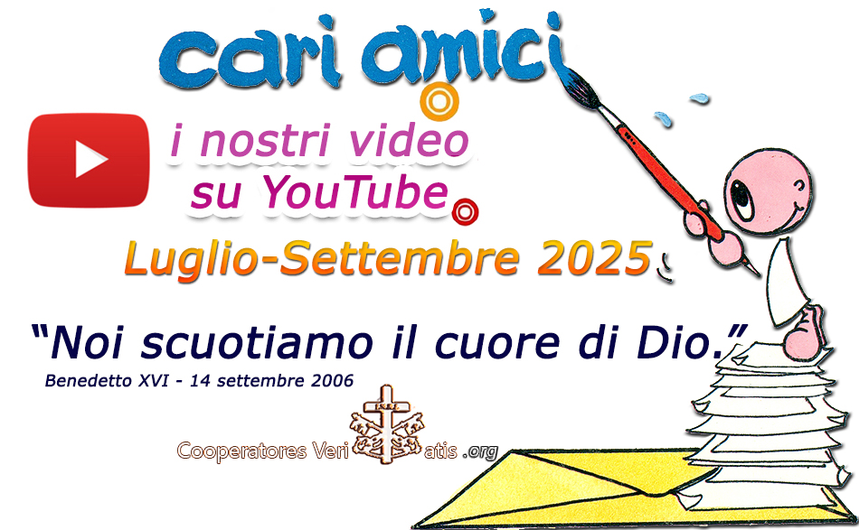 Raccolta video Luglio-Settembre 2025 PRECEDENTI VEDI QUI ELENCO Raccolta video Gennaio-Marzo 2025 Raccolta video Aprile-Giugno 2025 DIRETTE-LIVE 🙏 Gli Angeli Custodi (Breve meditazione) 🙏 Regina del Rosario di Pompei (Cenacolo 07-10-2025) 🙏 Supplica alla Regina delle Vittorie (07-10-2025) na devozione popolare per ignoranti? 🙏 San Bruno (Brunone) Sacerdote e monaco (Cenacolo 06-10-2025) San Francesco d’Assisi, il santo più deformato anche nella Chiesa 🙏 Santi Angeli Custodi (Giovedì eucaristico) La “Pascendi” di San Pio X: l’enciclica più profetica e più ignorata (3a parte) 🙏 Santa Teresa del Bambino Gesù e del Volto Santo (Cenacolo 01-10-2025) 🙏 San Girolamo vescovo e Dottore della Chiesa (Cenacolo 30-09-2025) L’anima o il mondo? La lunga battaglia al presunto individualismo salvifico 🙏 Santi Arcangeli Michele, Gabriele e Raffaele (Cenacolo) Pastorale senza Catechismo? (Tavola Rotonda) 🙏 Vergine del Rosario di San Nicolas-Argentina (Giovedì eucaristico) La “Pascendi” di San Pio X: l’enciclica più profetica e più ignorata (2a parte) 🙏 Beata Vergine Maria della Mercede (Cenacolo 24-09-2025) Una parola per descrivere Padre Pio 🙏 San Padre Pio da Pietrelcina (Cenacolo 23-09-2025) Santo Padre ci confermi nella Fede. Senza (troppe) interviste 🙏 L’Aiuto di Dio (Cenacolo del 22-09-2025) Autorità e obbedienza nella Chiesa San Giuseppe da Copertino (Giovedì eucaristico e sacerdotale) La “Pascendi” di San Pio X: l’enciclica più profetica e più ignorata 🙏 San Cipriano, vescovo e martire (16-09-2025) Perché la Croce è segno dell’unica vera religione 🙏 Beata Vergine Maria Addolorata ai piedi della santa Croce (15-09-2025) 🙏 Guai a diventare “i protestanti della Tradizione”! (Giovedì sacerdotale) 🙏 Beata Vergine Maria della Vita (10-09-2025) San Pier Giorgio Frassati: Il giovane Parsifal che possedeva la Verità 🙏 San Pietro Claver SJ (09-09-2025) La Natività della Vergine è rinascita della Chiesa 🙏 Festa della Natività di Maria Santissima Maternità spirituale sacerdotale: adottiamo un Sacerdote! La FSSPX al Giubileo 2025: uno straordinario Pellegrinaggio Romano 🙏 A Santa Rosalia, affidiamo i Sacerdoti (Giovedì eucaristico) Ecumenismo: problemi di ieri, sfide di oggi. Conferenza di Corrado Gnerre 🙏 San Gregorio Magno, Papa e Dottore della Chiesa (03-09-2025) 🙏 Beati Pietro Giacomo Maria Vitalis e 20 compagni, Martiri della Rivoluzione francese La Vergine Maria piange a Siracusa (Cenacolo 01-09-2025) 🔴 “Pietro ha parlato per bocca di Leone”. Tavola Rotonda sul Papato 🙏 Sant’Agostino d’Ippona (Giovedì sacerdotale) Kibeho, il pellegrino racconta 🙏 Santa Monica, madre di sant’Agostino (Cenacolo 27-08-2025) 🙏 San Giuseppe Calasanzio (Cenacolo 25-08-2025) 🙏 San Pio X Papa (Giovedì sacerdotale) 🙏 San Bernardo, Abate di Chiaravalle (Cenacolo 20-05-2025) 🙏 San Giovanni Eudes (Cenacolo 19-08-2025) Diretta dal Santuario di Kibeho col Rettore 🙏 Sant’Elena Imperatrice (Cenacolo 18-08-2025) 🙏 San Massimiliano Maria Kolbe martire (Giovedì sacerdotale) 🙏 Beato Marco d’Aviano (Cenacolo 13-08-2025) 🔴 Amiamo e difendiamo la Chiesa nostra Madre Santa Giovanna Francesca Fremiot da Chantal 🙏 Santa Chiara di Assisi (Cenacolo 11-08-2025) 🙏 San Gaetano da Thiene (Giovedì sacerdotale) 🙏 Trasfigurazione di Nostro Signore sul monte Tabor 🙏 Madonna della neve e della Salus Populi Romani (05-08-2025) 🙏 San Giovanni Maria Vianney (Cenacolo 04-08-2025) 🙏 Sant’Ignazio di Loyola (Giovedì sacerdotale) 🙏 San Leopoldo Mandic (Cenacolo 30-07-2025) 🙏 Santi Marta, Maria e Lazzaro Amici del Signore (Cenacolo) 🙏 San Vittore I Papa e martire (Cenacolo 28-07-2025) L’estremo NO a Dio. Conferenza di Corrado Gnerre 🙏 San Charbel Makhluf (Giovedì sacerdotale) Le Sante Donne dell’Antico Testamento 🙏 Santa Brigida di Svezia Compatrona d’Europa (cenacolo) 🙏 Santa Maria Maddalena (Cenacolo 22-07-2025) 🙏 San Lorenzo da Brindisi Sacerdote e Dottore della Chiesa (Cenacolo) La maternità spirituale per i sacerdoti (Tavola Rotonda) 🙏 I persecutori del Sangue & 16 Martiri Carmelitane di Compiègne 🔴 Ti censurerò! Oggi a MiL, domani a chi tocca? Tavola Rotonda con Luigi Casalini 🙏 Festa della Beata Vergine del Monte Carmelo (Cenacolo 16-07-2025) 🙏 San Bonaventura da Bagnoregio (Cenacolo 15-7-2025) 🙏 San Camillo de Lellis Sacerdote (Cenacolo 14-07-2025) L’infallibilità pontificia: un dogma controproducente? 🙏 Santa Veronica Giuliani e Festa dei Prodigi della Vergine 🙏 Meditiamo sul Preziosissimo Sangue di Gesù (Cenacolo) Esplosivo: la maggioranza dei Vescovi non voleva l’abolizione della Messa antica 🙏 Primo giorno Novena alla BVM del Monte Carmelo (Cenacolo 07-07-2025) 🙏 San Tommaso Apostolo (Giovedì eucaristico e sacerdotale) 🙏 La devozione al Preziosissimo Sangue e le preziose Litanie 🙏 Le Piaghe Sanguinanti (Cenacolo 01-07-2025) 🔴 “Tibi dabo claves regni caelorum” (Mt 16, 19) – Tavola Rotonda 🙏 Primi Santi Martiri della Chiesa di Roma (Cenacolo 30-06-2025) Leone XIII. Il magistero da riscoprire 🙏 San Josemaria Escrivà & Devozione a VIDEO REGISTRATI Le quattro ragioni di San Paolo per il velo muliebre L’abbandono dell’uso del velo muliebre in chiesa Lo Stato Pontificio e la presa di Roma Il Catechismo di San R. Bellarmino Dottore della Chiesa Leone XIV: Omelia e benedizione degli Agnus Dei Canto della Fede: Ti saluto o Croce Santa Canti per la Fede: Nome Dolcissimo Leone XIV al Borgo: tutto questo non può non parlarci di Dio La Preghiera di Leone XIV: Signore, tu ami tutto ciò che hai creato Il magistero profetico di San Pio X Papa Leone XIV: il matrimonio non è un ideale, ma il canone del vero amore tra l’uomo e la donna Leone XIV: Gesù non nega la verità del dolore, ma non permette che il male sia l’ultima parola Leone XIV: come Gesù anche noi dobbiamo essere segno di contradd