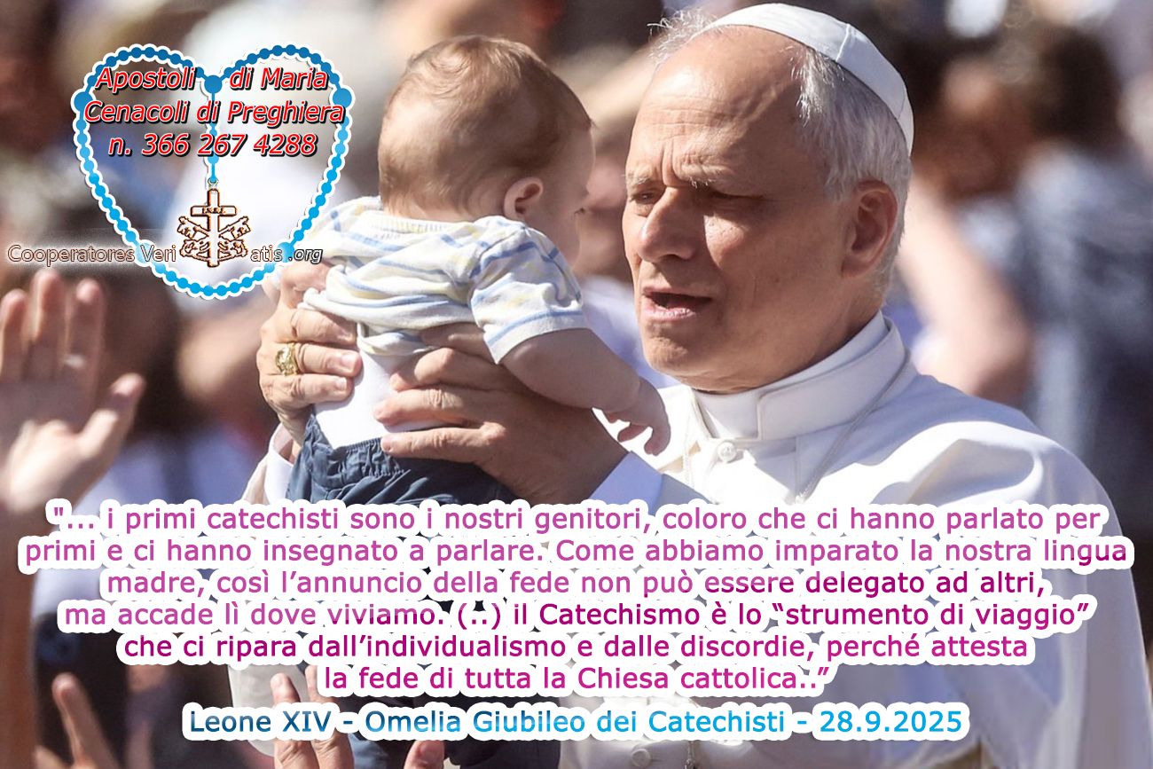 Tutti siamo stati educati a credere mediante la testimonianza di chi ha creduto prima di noi. Da bambini e da ragazzi, da giovani, poi da adulti e anche da anziani, i catechisti ci accompagnano nella fede condividendo un cammino costante, come avete fatto voi in questi giorni, nel pellegrinaggio giubilare. Questa dinamica coinvolge tutta la Chiesa: infatti, mentre il Popolo di Dio genera uomini e donne alla fede, «cresce la comprensione, tanto delle cose quanto delle parole trasmesse, sia con la contemplazione e lo studio dei credenti che le meditano in cuor loro (cfr Lc 2,19.51), sia con la intelligenza data da una più profonda esperienza delle cose spirituali, sia per la predicazione di coloro i quali con la successione episcopale hanno ricevuto un carisma sicuro di verità» (Cost. dogm. Dei Verbum, 8). In tale comunione, il Catechismo è lo “strumento di viaggio” che ci ripara dall’individualismo e dalle discordie, perché attesta la fede di tutta la Chiesa cattolica. Ogni fedele collabora alla sua opera pastorale ascoltando le domande, condividendo le prove, servendo il desiderio di giustizia e di verità che abita la coscienza umana.