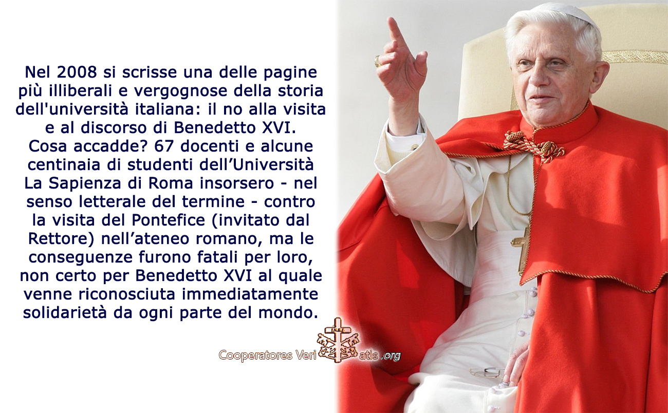 Papa Benedetto XVI fu costretto ad annullare la sua visita e la lectio magistralis alla Sapienza (Università paradossalmente fondata dal Pontefice) a seguito delle manifestazioni di protesta da parte di alcuni studenti e docenti dell’Ateneo, pochi per la verità ma agguerriti in prepotenza.