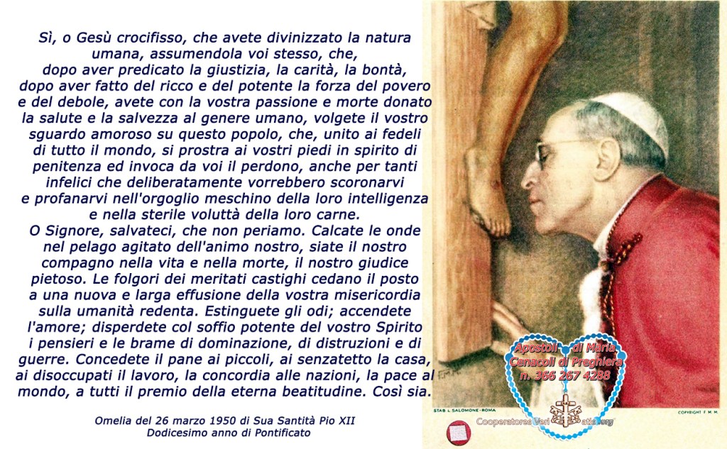 Sì, o Gesù crocifisso, che avete divinizzato la natura umana, assumendola voi stesso, che, dopo aver predicato la giustizia, la carità, la bontà, dopo aver fatto del ricco e del potente la forza del povero e del debole, avete con la vostra passione e morte donato la salute e la salvezza al genere umano, volgete il vostro sguardo amoroso su questo popolo, che, unito ai fedeli di tutto il mondo, si prostra ai vostri piedi in spirito di penitenza ed invoca da voi il perdono, anche per tanti infelici che deliberatamente vorrebbero scoronarvi e profanarvi nell’orgoglio meschino della loro intelligenza e nella sterile voluttà della loro carne. O Signore, salvateci, che non periamo. Calcate le onde nel pelago agitato dell’animo nostro, siate il nostro compagno nella vita e nella morte, il nostro giudice pietoso. Le folgori dei meritati castighi cedano il posto a una nuova e larga effusione della vostra misericordia sulla umanità redenta. Estinguete gli odi; accendete l’amore; disperdete col soffio potente del vostro Spirito i pensieri e le brame di dominazione, di distruzioni e di guerre. Concedete il pane ai piccoli, ai senzatetto la casa, ai disoccupati il lavoro, la concordia alle nazioni, la pace al mondo, a tutti il premio della eterna beatitudine. Così sia.