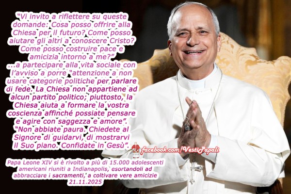 Incontro digitale di Papa Leone XIV con i Giovani americani durante la Conferenza Nazionale dei Giovani cattolici (National Catholic Youth Conference NCYC) [Lucas Oil Stadium di Indianapolis (Indiana-Stati Uniti), 20-22 novembre 2025] In questo momento che stiamo pubblicando, non esiste ancora un testo da poter leggere (auspichiamo che venga fatto per l'importanza dei suoi contenuti),... Continua a leggere →
