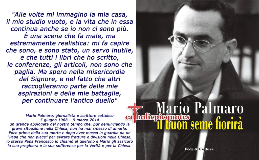 Mario Palmaro (Cesano Maderno, 5 giugno 1968 – Monza, 9 marzo 2014), sposo e padre di quattro figli, è stato uno dei più importanti apologeti cattolici degli ultimi anni. Laureato in Giurisprudenza nel 1995 presso l’Università degli Studi di Milano con una tesi sull’aborto procurato, si è perfezionato in bioetica all’Istituto San Raffaele di Milano nel 1996 e ha collaborato con il Centro di Bioetica della Università Cattolica di Milano. È stato docente di filosofia teoretica, etica e bioetica presso la facoltà di bioetica del Pontificio Ateneo Regina Apostolorum di Roma e di filosofia del diritto presso l’Università Europea di Roma. Ha all’attivo pubblicazioni su temi di bioetica e, insieme all’amico di sempre Alessandro Gnocchi, di apologetica cattolica e costume. È stato redattore del mensile cattolico Il Timone e ha collaborato con i quotidiani Il Foglio e Il Giornale, e il mensile Studi cattolici. È stato segretario generale della Fondazione Emit Feltrinelli di Milano, presidente nazionale del Comitato Verità e Vita, membro dell’Associazione Giuristi per la Vita e dell’Unione Giuristi Cattolici Italiani per la sezione di Monza e Brianza. Ha ricevuto il Premio Fede & Cultura a Verona nel 2013 per la vita e l’apologetica cattolica. È scomparso nel 2014 all’età di 45 anni a seguito di una grave malattia.