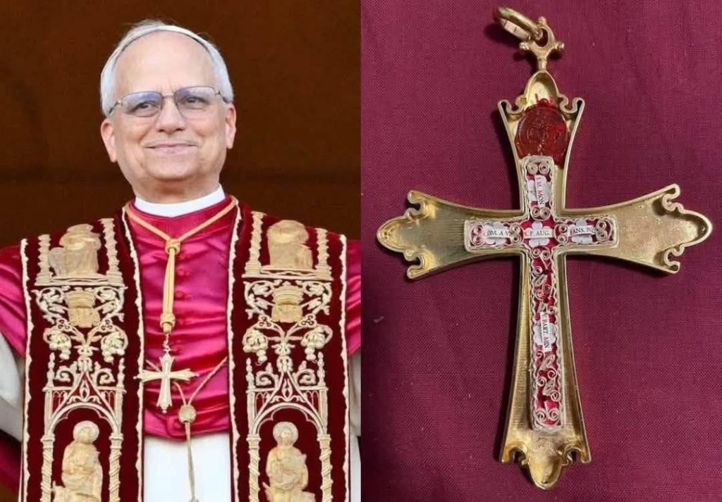Il Santo Padre Leone XIV indossava la croce pettorale con le reliquie di alcuni Santi e Beati dell’Ordine Agostiniano. Questa croce fu commissionata dal postulatore generale don Josef Sciberras, quando l’allora vescovo Robert Prevost fu nominato cardinale da Papa Francesco. La croce interna è impreziosita da una doppia croce in tessuto moiré, una decorazione Paperoles e le reliquie di Sant’Agostino, Santa Monica e alcuni beati dell’ordine.