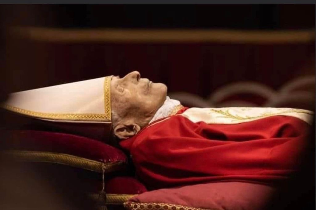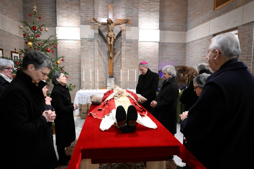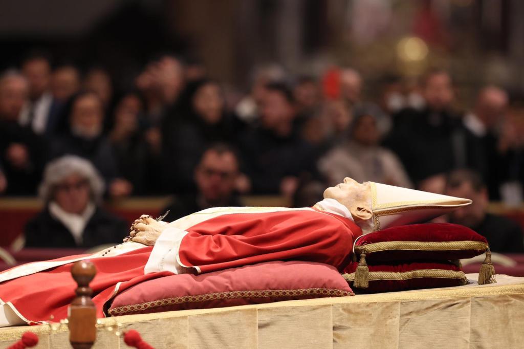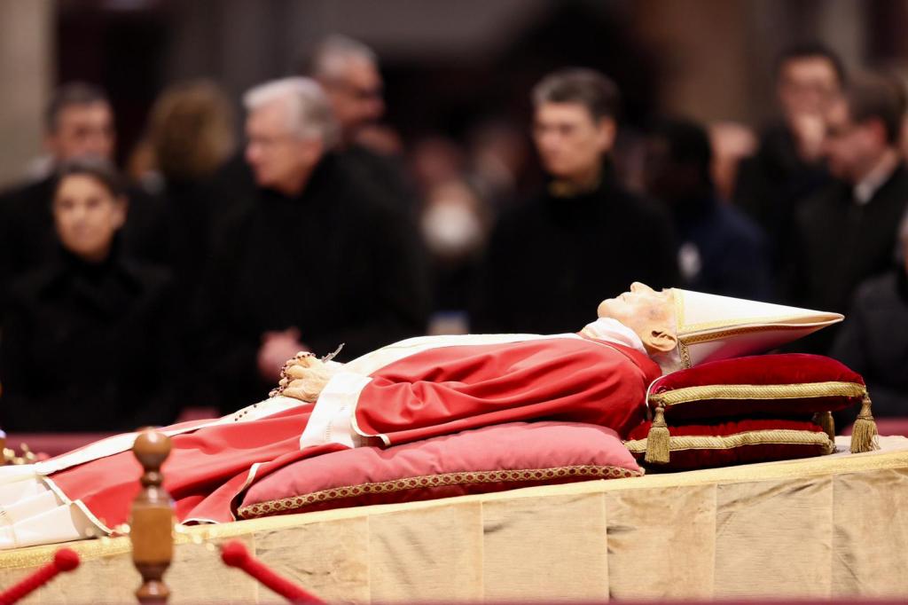 2 gennaio 2023, allestimento nella Basilica Vaticana di san Pietro per l’ultimo saluto dei Fedeli la salma resterà così fino al 4 gennaio, il giorno 5 ci saranno i funerali solenni celebrati da papa Francesco in piazza san Pietro.