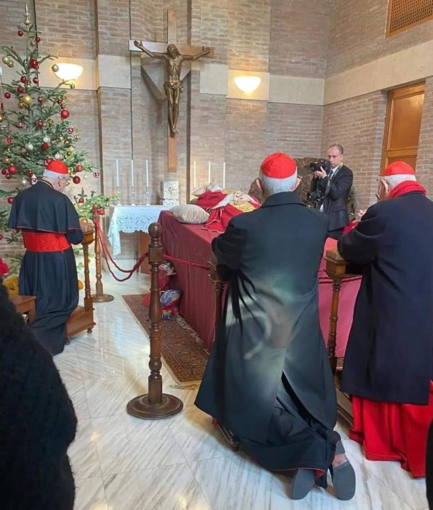Eravamo lì, ognuno poi ha pregato in silenzio, e alle 9.34 ha fatto l’ultimo respiro. Poi abbiamo continuato le preghiere non più per il moribondo ma per il morto. E abbiamo concluso cantando Alma Redemptoris Mater. È morto nell’ottava di Natale, il suo tempo liturgico preferito, nel giorno di un suo predecessore — san Silvestro, Papa sotto l’Imperatore Costantino. Era stato eletto nella data in cui si fa memoria di un Papa tedesco, san Leone IX , dell’Alsazia; è morto nel giorno di un Papa romano, san Silvestro. Ho detto a tutti: «Chiamo subito Papa Francesco, è il primo che deve sapere». L’ho chiamato, e lui ha detto: «Vengo subito!». Poi è venuto, l’ho accompagnato nella stanza da letto dove è morto e ho detto a tutti: «Rimanete». Il Papa ha salutato, gli ho offerto una sedia, si è seduto accanto al letto e ha pregato. Ha dato la benedizione e poi si è congedato. Questo è accaduto il 31 dicembre 2022.