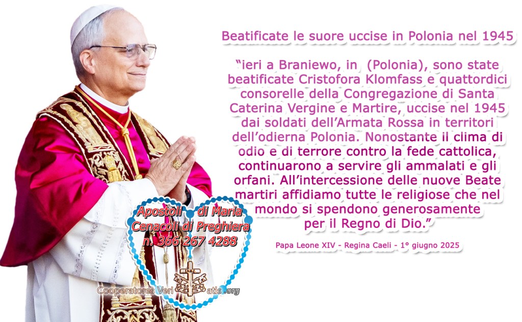 Concistoro Ordinario Pubblico per il voto su alcune Cause di Canonizzazione 13 giugno 2025 L’Ufficio delle Celebrazioni Liturgiche del Sommo Pontefice comunica che questa mattina, alle ore 9, nella Sala del Concistoro del Palazzo Apostolico Vaticano, il Santo Padre Leone XIV ha presieduto la celebrazione dell’Ora Terza e il Concistoro Ordinario Pubblico per la Canonizzazione dei Beati: