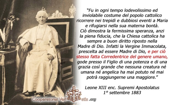 La santa Madre di Dio e Madre Nostra è, perciò, "CORREDENTRICE del genere umano...". Leggendo questa enciclica di Leone XIII, cerchiamo di capire il perchè, invece di negarlo. Scarica qui il pdf SUPREMI APOSTOLATUS LETTERA ENCICLICA DI SUA SANTITÀLEONE PP. XIII A tutti i Venerabili Fratelli Patriarchi, Primati, Arcivescovi eVescovi del mondo cattolico che hanno... Continua a leggere →