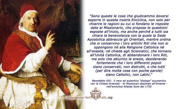 Benedetto XIV: il vero ed autentico "dialogo" ecumenico con le Chiese Orientali - Ai Missionari destinati all’Oriente - nell'enciclica Allatae Sunt del 1755 "Sono queste le cose che giudicammo doversi esporre in questa nostra Enciclica, non solo per chiarire le ragioni su cui si fondano le risposte date al Missionario, che propose le questioni esposte... Continua a leggere →