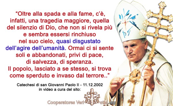 In una Catechesi dell'11 dicembre 2002, Giovanni Paolo II affrontò il tema delle LAMENTELE DEL POPOLO, riportato in Geremia, il quale però giunse a supplicare Dio DOPO LA CONVERSIONE E LA PURIFICAZIONE.... Oggi si sta pretendendo l'aiuto di Dio rimanendo placidamente contenti nel proprio peccato.. ed anzi, si pretende che Dio faccia qualcosa in nostro... Continua a leggere →