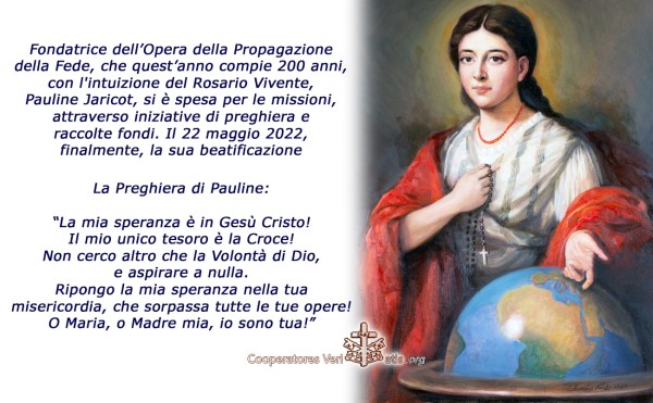 Fondatrice dell’Opera della Propagazione della Fede, che quest’anno compie 200 anni, con l'intuizione del Rosario Vivente, Pauline Jaricot, si è spesa per le missioni, attraverso iniziative di preghiera e raccolte fondi. Il 22 maggio 2022, finalmente, la sua beatificazione. Il 25 febbraio 1963 fu dichiarata Venerabile da San Giovanni XXIII. Il 26 maggio 2020 papa... Continua a leggere →