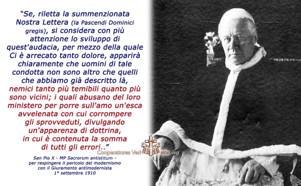 Il 1° settembre 1910 san Pio X con il Motu Proprio "Sacrorum antistitum" ribadisce la condanna del Modernismo e dei loro diffusori definendoli: "una genia perniciosissima di persone" e, ricordando i punti fondamentali della Pascendi Dominici gregis - CLICCA QUI - sottolinea i mezzi per estirpare le loro eresie. In questo MP vi unisce l'obbligo,... Continua a leggere →