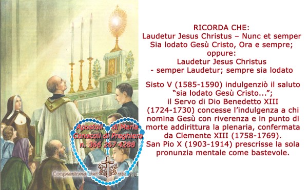 "...perché nel nome di Gesù ogni ginocchio si pieghi nei cieli, sulla terra e sotto terra; e ogni lingua proclami che Gesù Cristo è il Signore, a gloria di Dio Padre." (Fil.2,10-11) La giaculatoria: "Gesù mio, misericordia", recitata con cuor contrito, ha l'Indulgenza parziale applicabile anche alle sante Anime del Purgatorio. E sempre Papa Sisto... Continua a leggere →