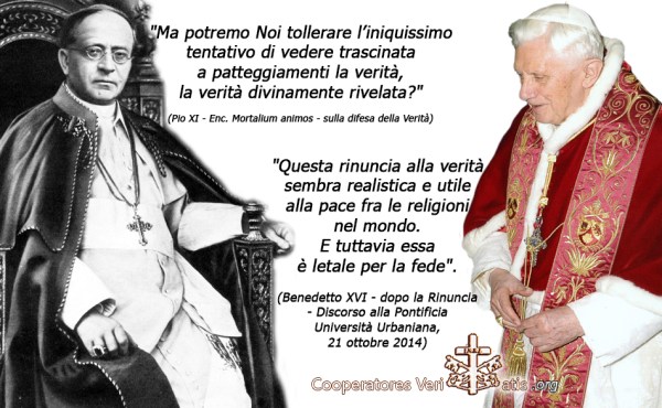 "Ma potremo Noi tollerare l’iniquissimo tentativo di vedere trascinata a patteggiamenti la verità, la verità divinamente rivelata?" (Pio XI - Enc. Mortalium animos - sulla difesa della Verità) "Questa rinuncia alla verità sembra realistica e utile alla pace fra le religioni nel mondo.E tuttavia essa è letale per la fede". (Benedetto XVI - Discorso del... Continua a leggere →