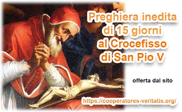 Dal Breviario "La via del Paradiso", arricchito di molti esercizi di devozione corporale quali le elemosine ed altri atti di carità, e quelli spirituali ad arricchimento dell'anima, datato 1860, vi offriamo questa inedita Preghiera scritta da San Pio V che soleva fare - contemplando davanti al Crocefisso - per 15 giorni consecutivi, per concludere poi... Continua a leggere →