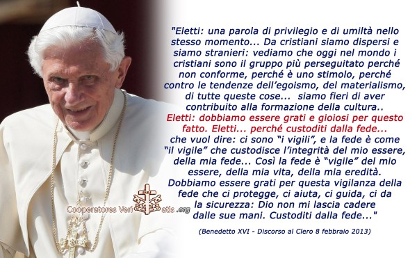 Benedetto XVI: grati a Dio per averci eletti cristiani e cattolici… custodi della Fede.