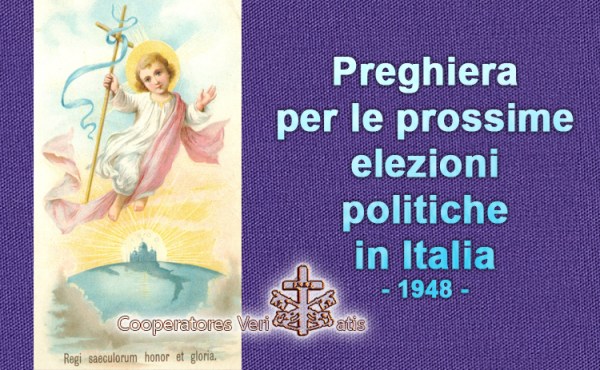 Preghiera per le prossime elezioni politiche Padre Nostro che sei nei cieli e governi l'universo, concedi alla nostra Patria la grazia di avere rappresentanti veramente cristiani, affinché, anche per loro mezzo, sia glorificato il Tuo Santo Nome e si estenda il Tuo regno di fede e di amore a tutto il popolo italiano; sia fatta... Continua a leggere →
