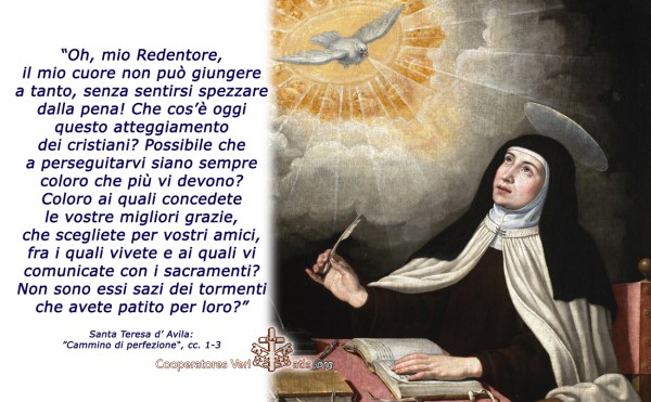 Riflessioni di Santa Teresa d'Avila, Dottore della Chiesa, sul protestantesimo imperante e dilagante nel suo tempo e che devono farci riflettere sui nostri comportamenti, oggi, nella Chiesa e nel mondo contemporaneo. Buona meditazione. Ricordiamo che potrete scaricare QUI il "Libro della mia vita" autobiografia della Santa in comodo pdf. CLICCA ANCHE QUI: Il Pater Noster... Continua a leggere →