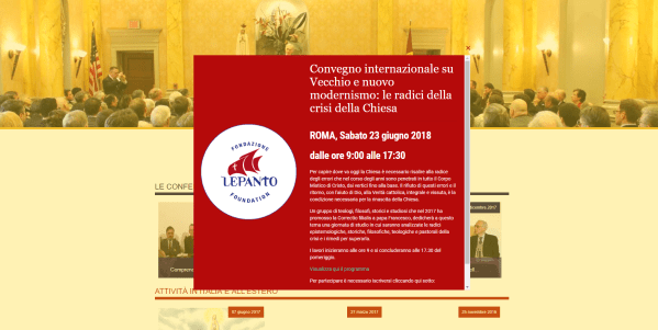 La Fondazione Lepanto presenta il Convegno: Vecchio e nuovo Modernismo: radici della crisi nella Chiesa Roma Hotel Massimo d’Azeglio via Cavour, 18 sabato 23 giugno 2018 Programma Mattino Dott. Joseph Shaw, Presidente della Latin Mass Society e Segretario della Federazione Internazionale Una Voce Prof. Roberto de Mattei, storico, Direttore di Corrispondenza Romana e Presidente della Fondazione Lepanto: «Il modernismo: radici e conseguenze storiche» Prof.... Continua a leggere →
